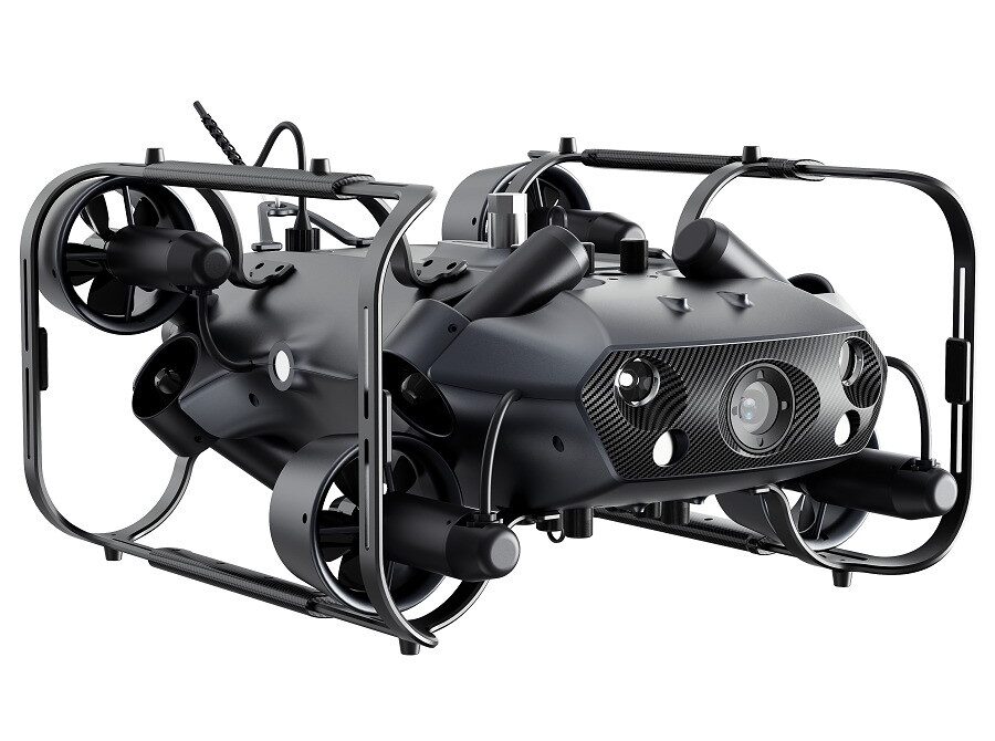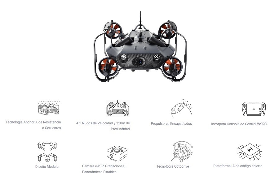 - Estándar: ROV, control remoto impermeable, batería 1000 Wh, cable de 400 m, estuche rígido, mochila para accesorios.